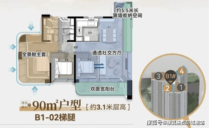 建面90㎡三房两厅两卫(刚需爆款):河汉从城少见的小户型三房,仅正在北地块B1栋有80套正在售,利用率达105%,赠送5。4㎡拓展空间;东南向户型高层可看金融城天际线,南向户型望社区园林,部门高层房源可远眺广州塔,三开间朝南设想采光,双卫结构处理刚需家庭日常利用需求,总价820万起,是从城上车的优选户型,库存严重,先到先得。